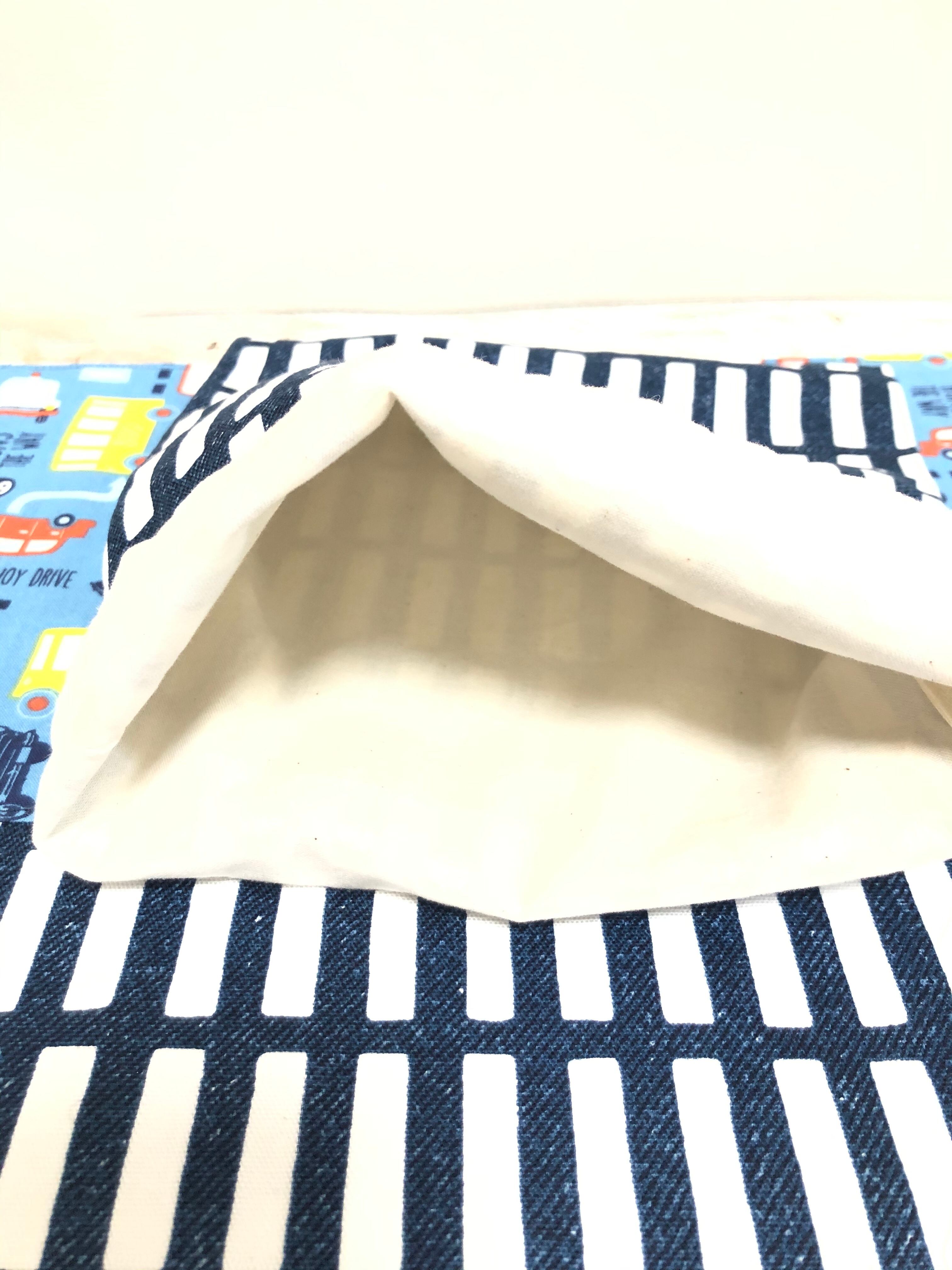 こちらは、北欧調シカクのインディゴブルーと車柄がカッコイイ☆コップ袋とランチョンマットのセットになります!