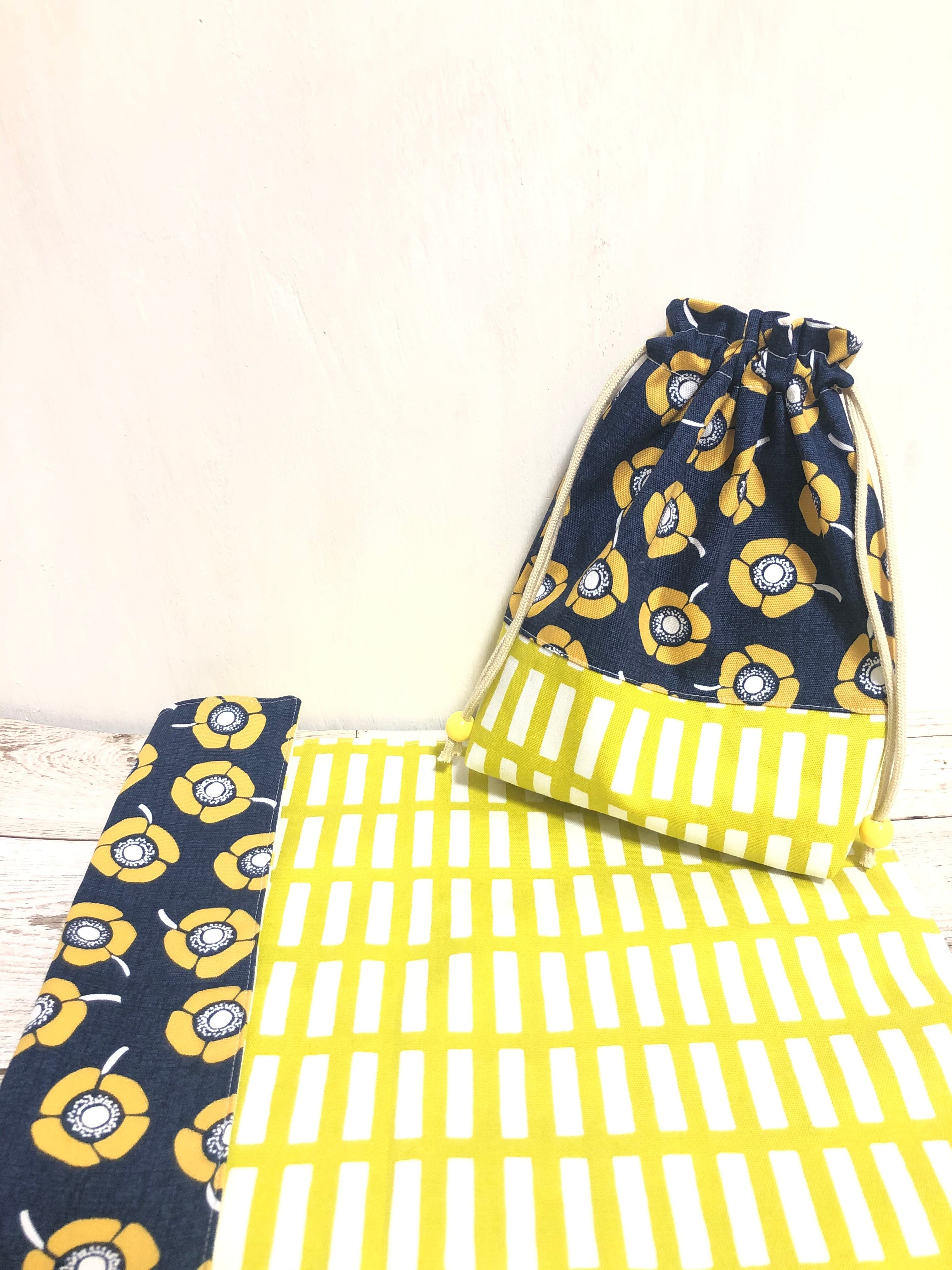 こちらは、北欧調アネモネと北欧調シカク柄が、シンプルでおしゃれな巾着とランチョンマットのセットになります!