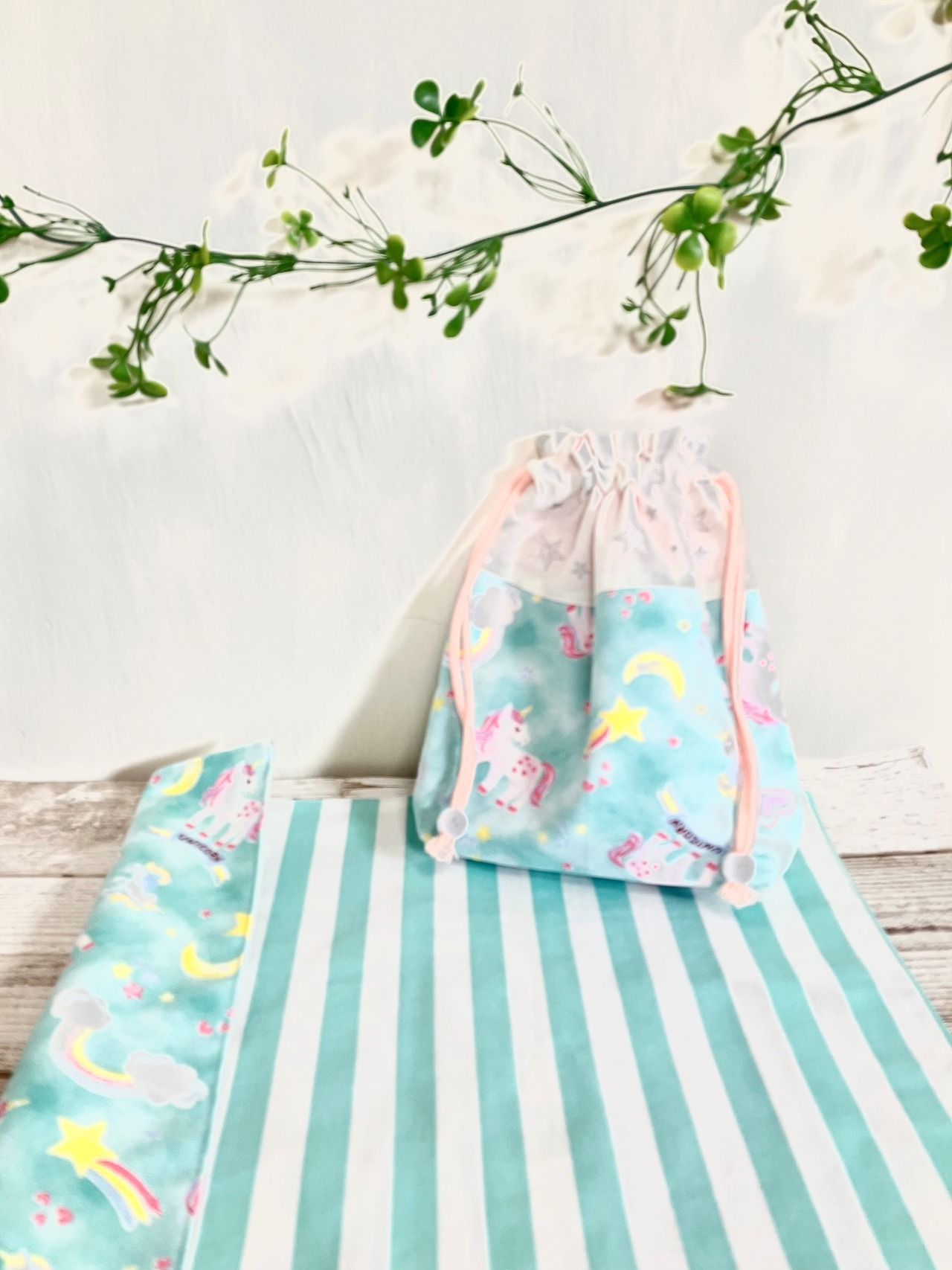 ユニコーン柄が可愛い♡コップ袋とランチョンマットのセットになりやす。